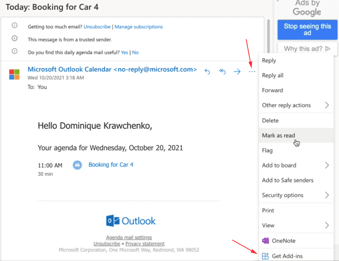 The QReserve Outlook Add-in is available directly from the Office Store. Accessing the Office Store differs across application versions but can usually be found from any email by clicking on the 3 dots at the top right and then selecting Get Add-ins from the menu.