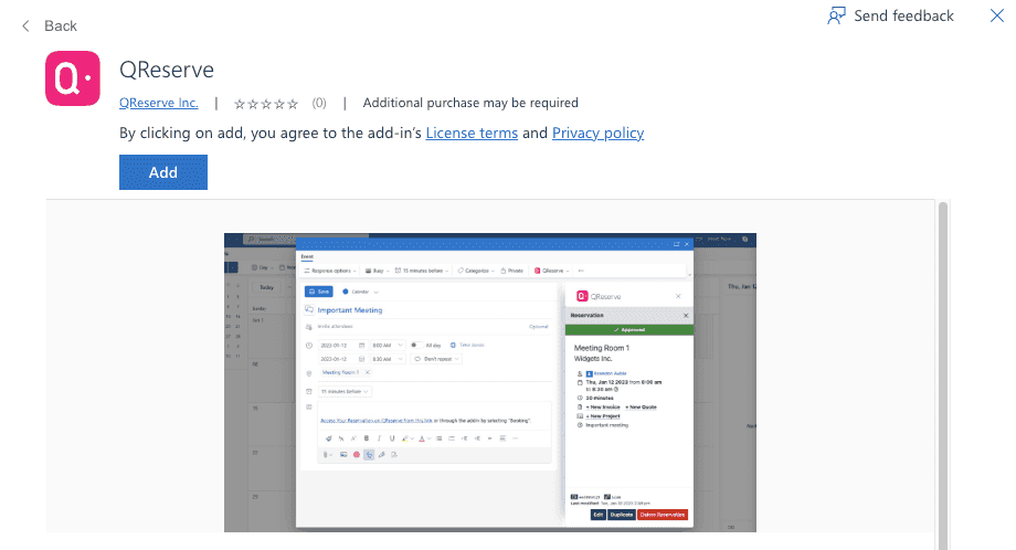 After selecting the QReserve Add-In, click the Add button to install the add-in to your account.
