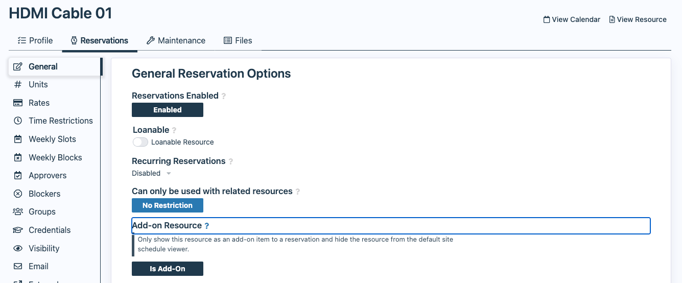 An Add-on resource will only be shown as an add-on item to a reservation and cannot be booked on it's own.